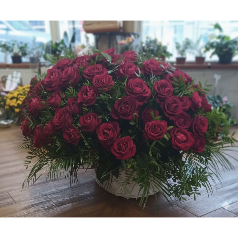 аранжирани в стилна бяла кошница. Ръчно изработен шедьовър, който спира дъха.